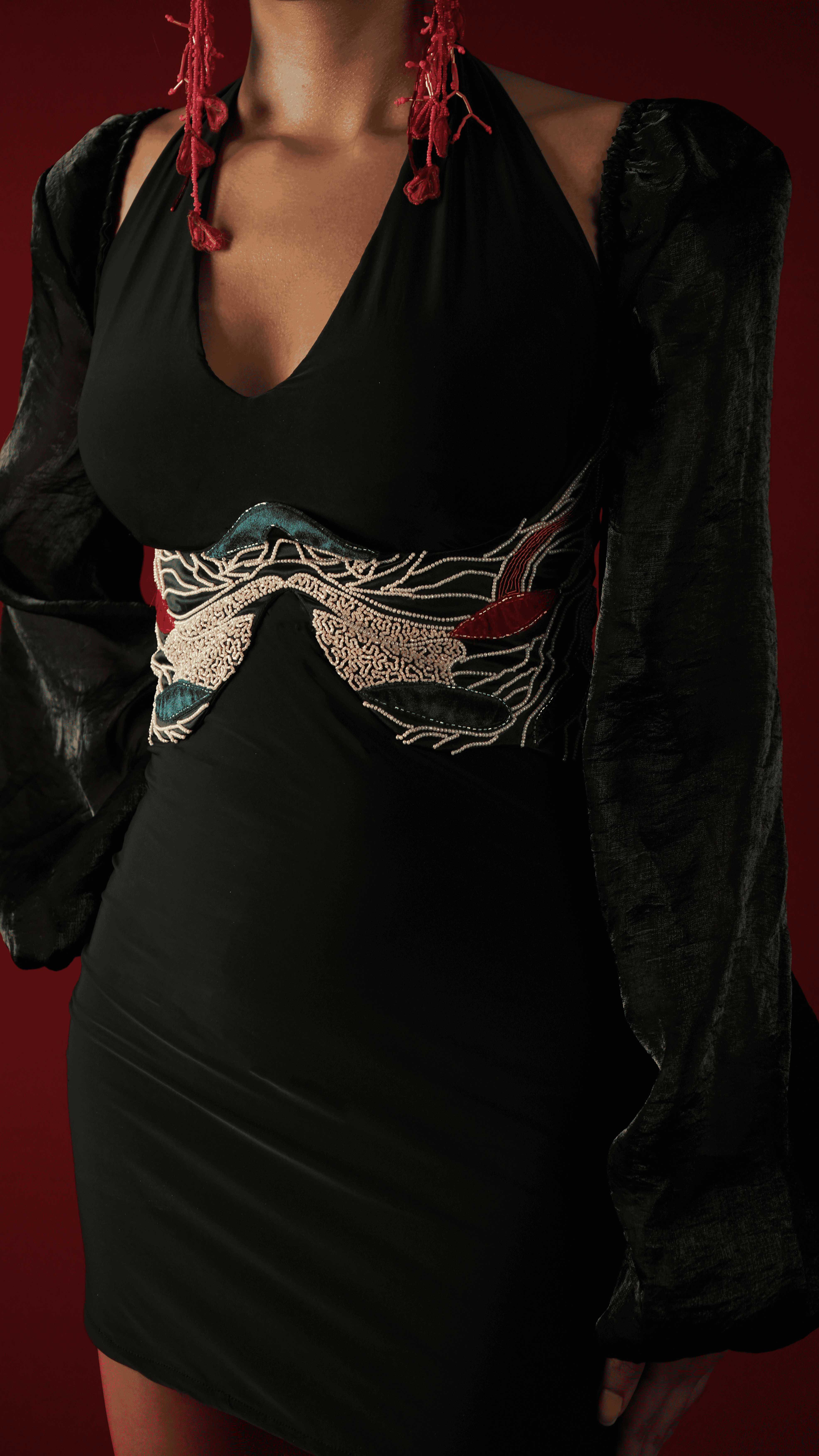 Shaped like petals opening under a midnight sky, this sculptural underbust corset features delicate beaded veins and vivid appliqué that bring texture and life to every curve. The dramatic balloon sleeves flow with ease, echoing the quiet wildness of a forest at night. Paired with a halter-neck bodycon dress in silky malai lycra, the look balances structure and softness with striking grace.