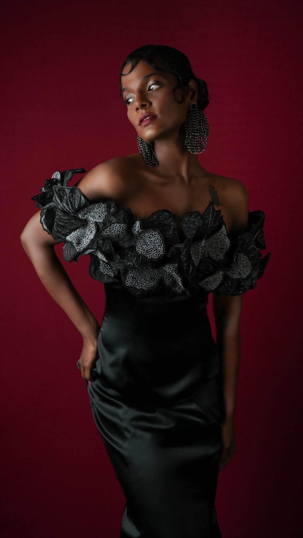 Imagine a flower in full bloom, bathed in moonlight. Velvessa is a silky satin mermaid gown, its off-shoulder silhouette adorned with sculpted appliqué flowers. Each bloom, with intricate paani embroidery and delicate beadwork, adds a touch of wild elegance, creating a gown that’s as fierce as it is beautiful.